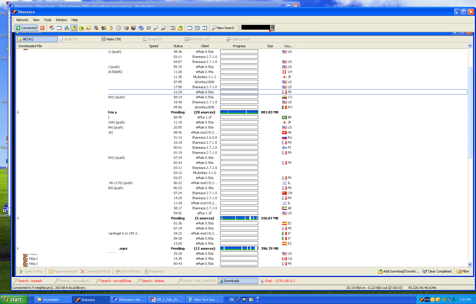Deadlock and livelock: related to the above, the problem might instead be that the threading in Shareaza is prone to deadlock (wedges the hub) or livelock (temporarily jams at least some of its operations) trying to acquire mutexes. The cause would be if handling new inbound hub to hub connections acquires some particular two mutexes and holds them simultaneously and some other operation (maybe outbound hub to hub connection establishment) acquires the same mutexes in the reverse order and holds them simultaneously. Livelock instead of deadlock results if there's some slow timeout or something to eventually give up trying to get a mutex and abort the associated operation. The fix is essentially the same: fix the bug (this time by making both processes try to acquire the relevant mutexes in the same order) and push out 2.7.2.0, then see if the problem goes away.