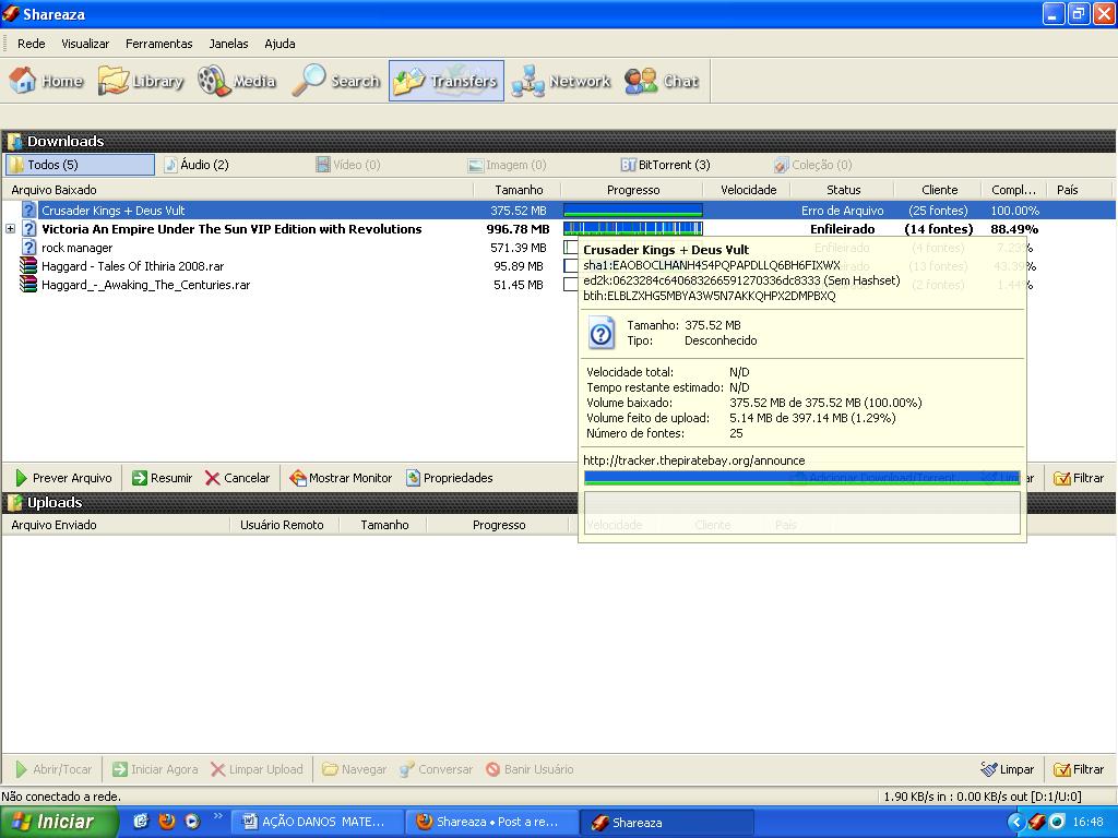 This is my first post here. Been using Shareaza for years. Recently I upgraded to 2.5.1, but then all my new torrents didn't finish... They all get to about 99.95%, but then stop. There are sources, Other torrents keeps d/ling (until they reach 99.95% as well), but the torrents never complete. Ever. I've created an examplarary screenshot to demonstrate my problem, but I'm quite clueless as to why this is happening :? .