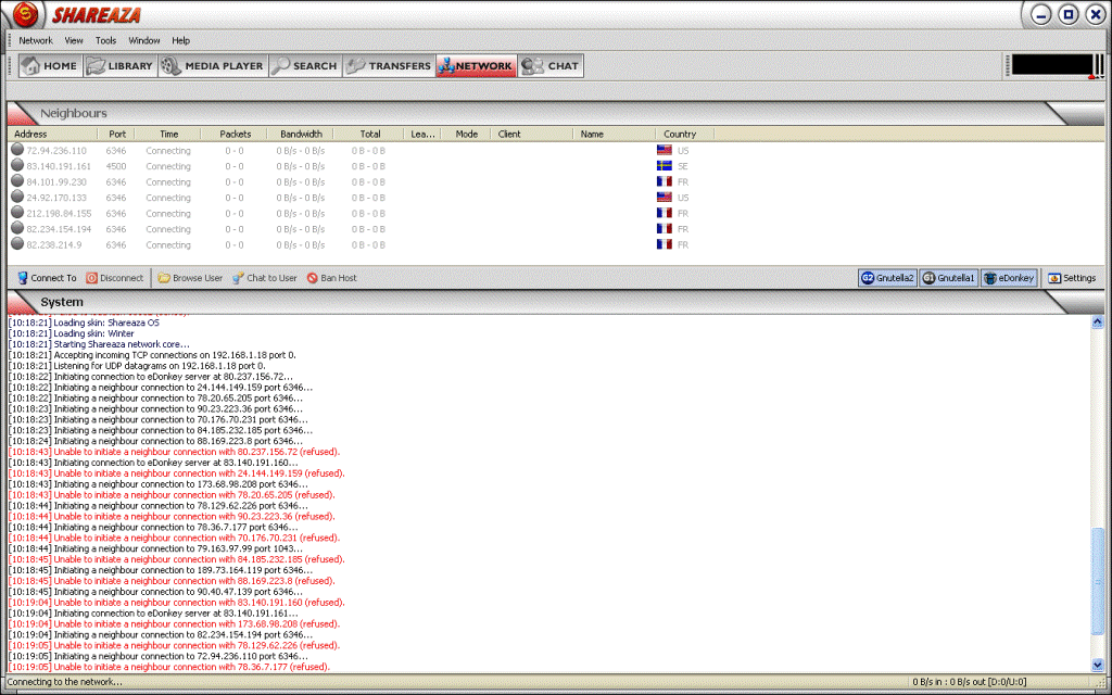 I upgraded to Shareaza 2.5 and no change. I downloaded the clean install and ran it and reloaded but still no connection. I then went through all the instructions to make sure my router was setup correctly (made changes and rebooted), per instructions changed zone-alarm and symantec, downloaeded the TCP/IP modification for XP, followed Old Death's instructions for installation and still nothing. Did another clean install of Shareaza and processed the connection test all (both) came back as connected and green. Problem though is I still cannot connect even though the connection test shows everything is fine. In the network window you can see where Shareaza is trying to connect but they come back a connection refused. Beginning to think my Verizon DSL is being blocked by someone outside.